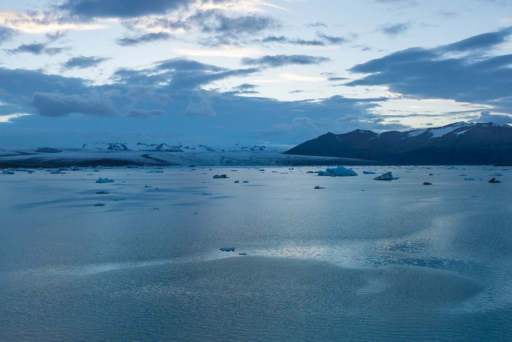 Iceland - Coast of glacier lagoon joekulsarlon with floating ice swimming on the glacial lake in the night