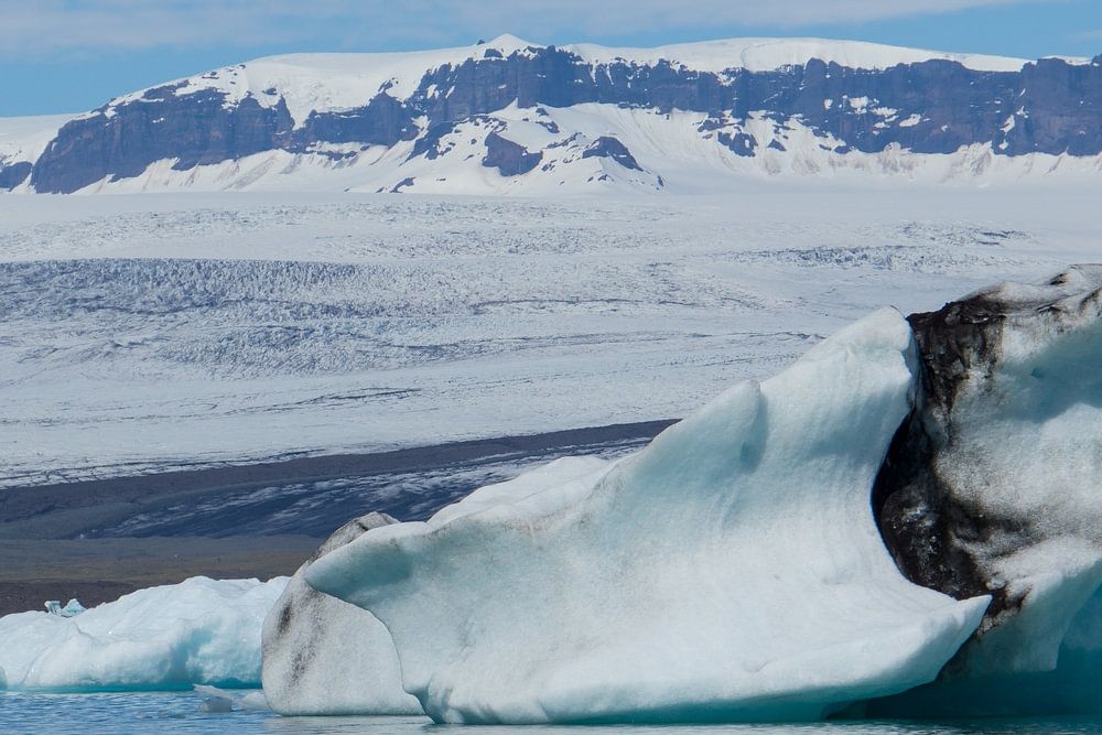 Iceland - Impressive iceberg drifting in glacial lake Jökulsárlón with glacier vatnajoekull in background