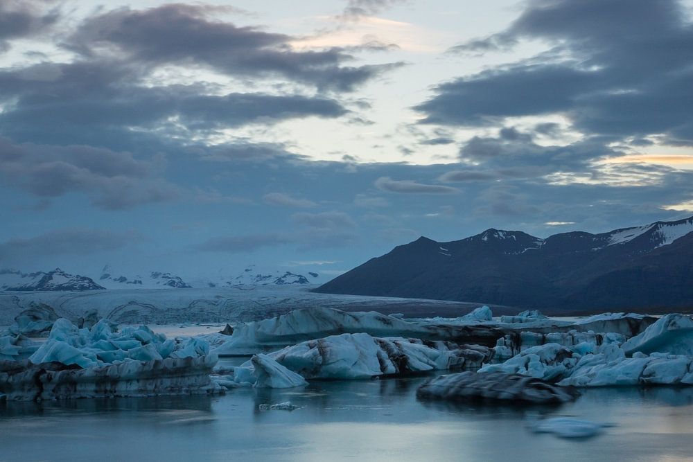 Iceland - Night over glacier lagoon joekulsarlon with moving ice floes and glowing clouds in the night, reflecting in the silent water, magical