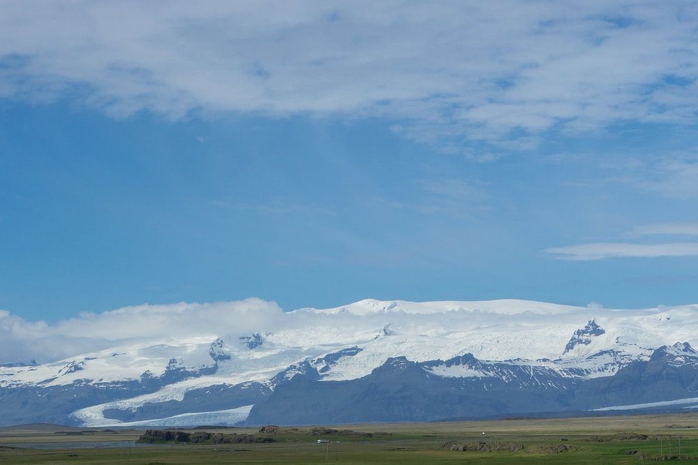Iceland - White mountains of glacier vatnajoekull behind endless green grassland fields and pastures nature landscape panorama