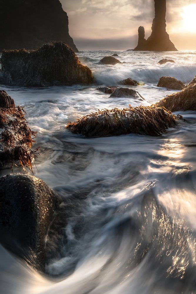 Beach of VIK in front of the rocky peaks Reynisdrangar Skessudrangur Landdrangur and Langsamur. Dramatic light and surf on the south coast of Iceland. Portrait / vertical image.