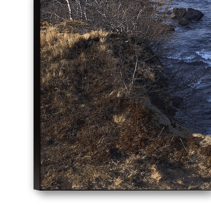 The picture shows an impressive Icelandic river flowing powerfully through a vast, rugged landscape. The water is wide and fast, with foaming white waves churning over dark rocks - a clear sign of the natural power this river carries. On its banks are lava fields and moss-covered hills, providing a stark contrast to the clear, cold water that probably comes from melting glaciers higher up in the mountains. Mountains rise in the distance, jagged in shape and partly covered in mist, giving the scene a mysterious, almost otherworldly atmosphere. The sky above is open and grand, with heavy clouds hanging low, typical of the Icelandic climate. This river seems to cut through the landscape like a lifeline - powerful, pure and untouched. A place where the primal force of nature is palpable in every detail.