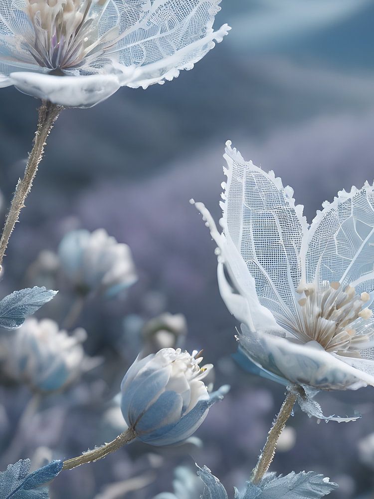 This artwork invites the viewer to explore the delicate structure of nature, represented by the finely woven petals that appear almost translucent. Every detail, from the veins in the leaves to the texture of the stems, has been carefully crafted to capture the fragile aesthetic of a flowering plant. The cool shades of blue and grey contrast with the softness of the flowers, giving a sense of calm and stillness.