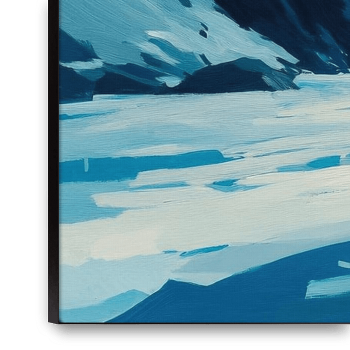 A fascinating winter panorama unfolds in cool shades of blue and white, where majestic mountains look as if they are embracing the sky. The glistening snow gently reflects the light and creates a calm, dreamlike atmosphere. This artwork is perfect for the living room, where it conveys a calming aura and stimulates conversation.