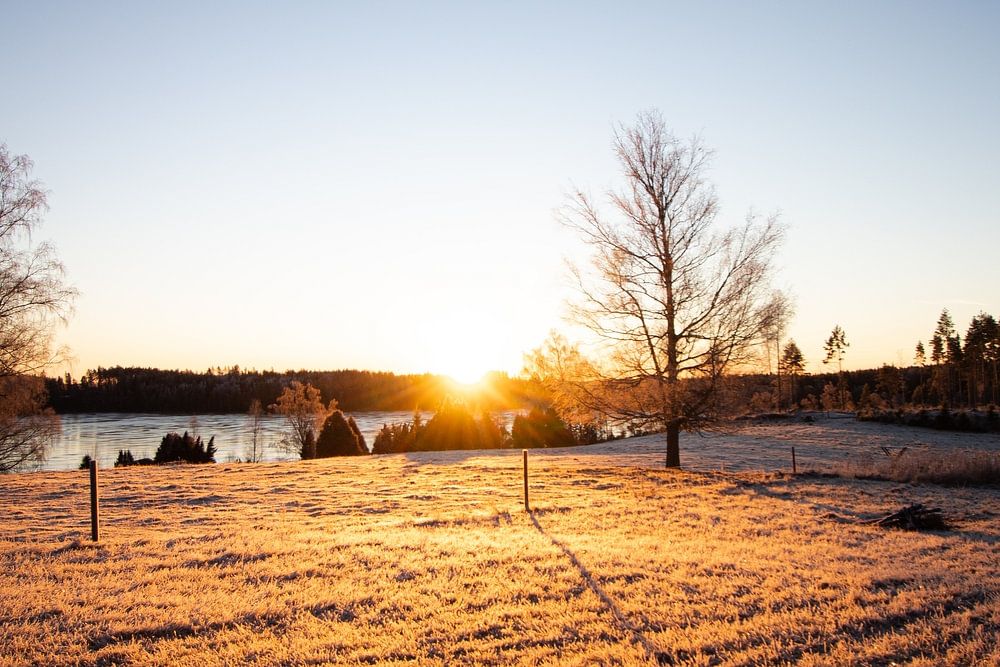 A breathtaking image of a frozen field in Sweden, with the sun just rising above the trees, bringing a beautiful orange glow to the landscape. The frozen ground reflects the colours of the rising sun, creating a unique and stunning contrast between the white sleet and the warm colours of the sunrise. A photograph that beautifully captures the sheer beauty of nature.