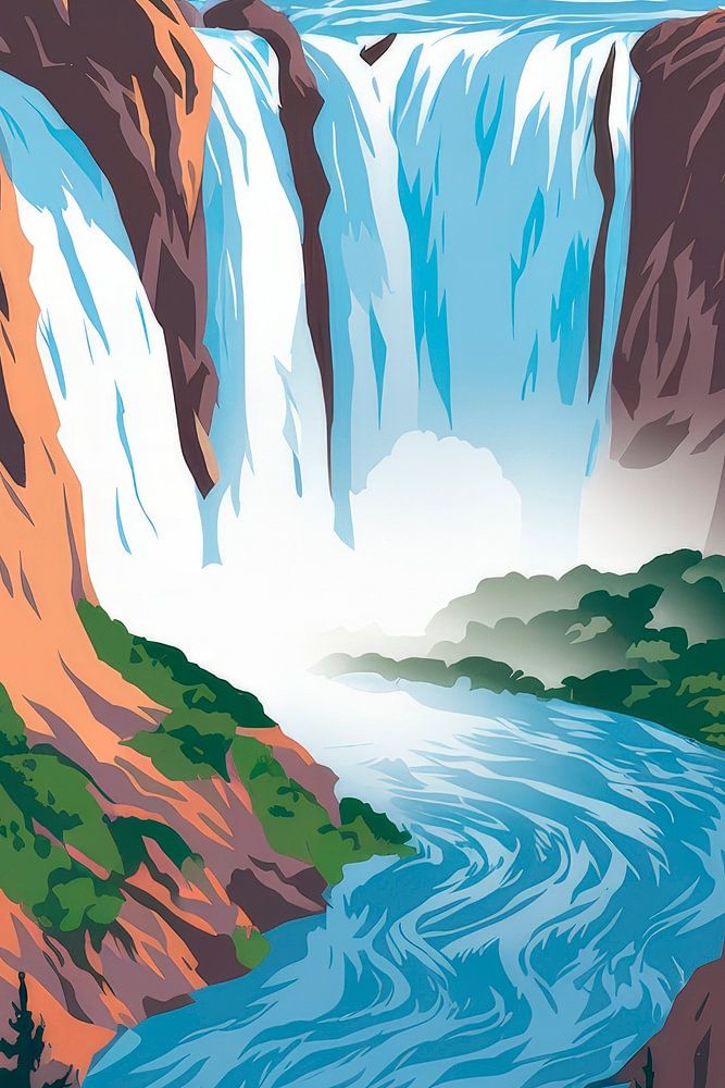 Majestic waterfalls cascade down, surrounded by lush greenery and picturesque mountains. The vibrant colours and dynamic flow of water create a calming atmosphere. This artwork captures the beauty of nature and is perfect for the living room, where it creates a relaxing oasis of calm.