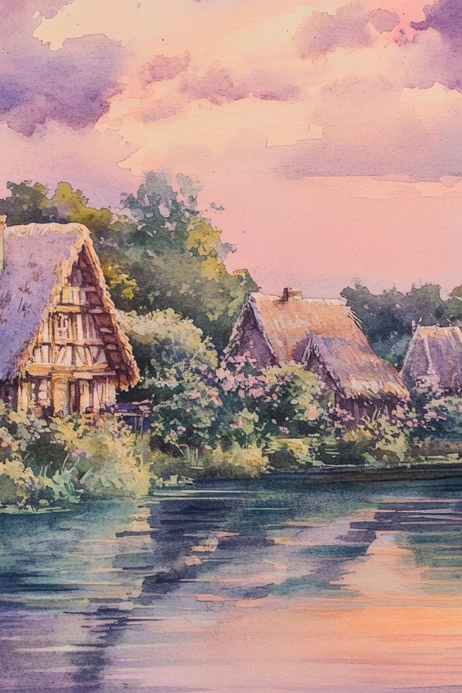 Idyllic farmhouses framed by gentle hills are reflected in the calm water, while gentle clouds play around the sunset. This harmonious scenery brings peace and tranquillity to any living room and transforms it into a natural retreat. Ideal for relaxing hours with a view of the beauty of rural idylls.