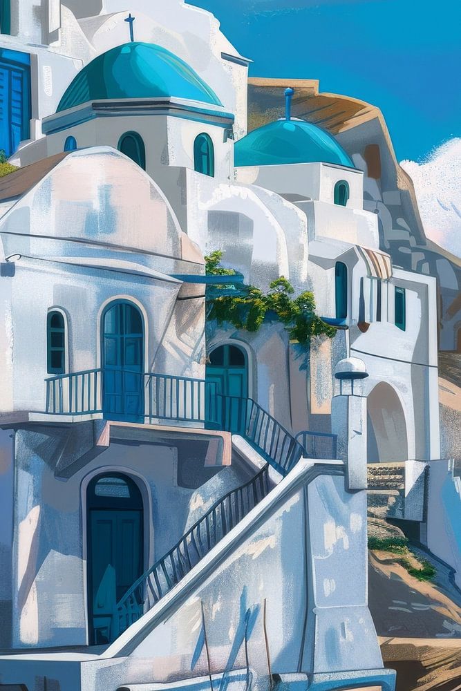 The picture shows a picturesque coastal panorama with white buildings perched harmoniously on a steep slope. The bright blue domes and doors form an impressive contrast to the bright blue sea. A small boat lingers gently on the water while soft clouds dot the clear sky. Pure Mediterranean idyll!