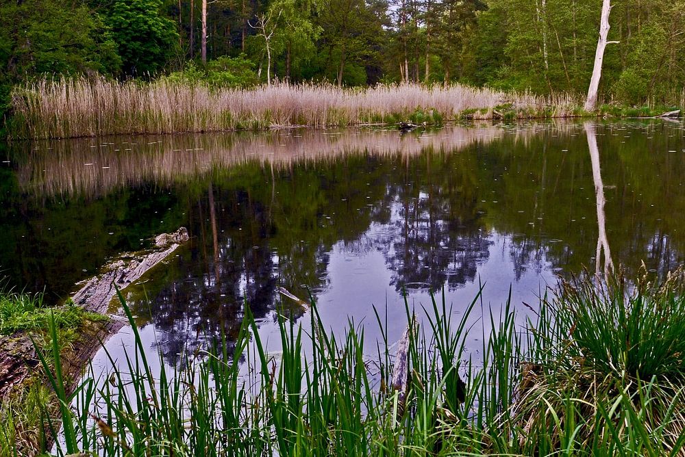 This enchanting, harmonious landscape photograph was taken at the end of May 2021 in the late evening hours at a hidden forest lake. Unspoilt, fairytale lake water surrounded by dense mixed forest and bizarre reed grass invite you to take an extensive nature walk. The motif radiates calm and serenity. It captivates with its meditative ambience and promises relaxation of mind and soul.