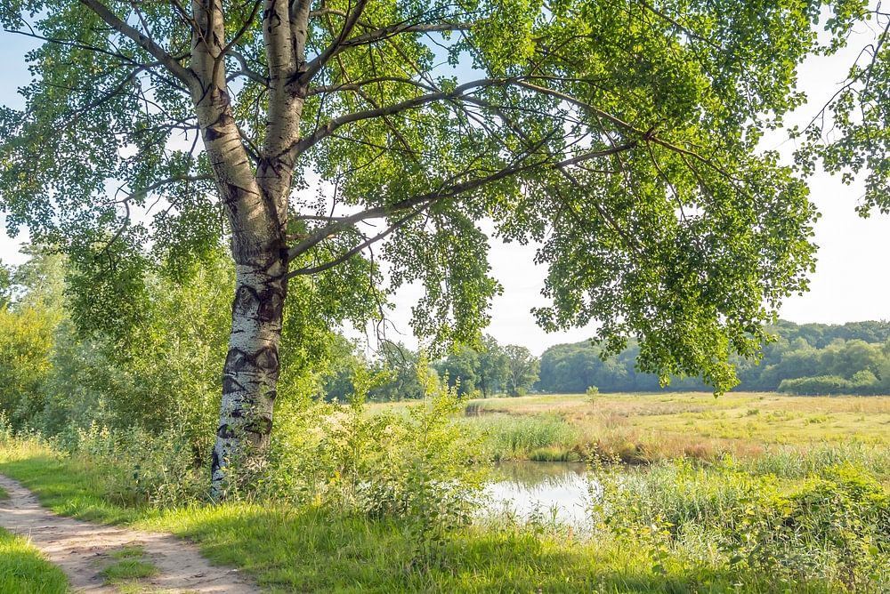 Picturesque landscape on the edge of a Dutch forest. Along the sandy path, a gray poplar tree is a real eye-catcher. To the right of the image, water is an open area. It is still early in the morning of a sunny summer day. The photograph was taken in a nature reserve near the village of Halsteren, municipality of Bergen op Zoom, province of Noord-Brabant.