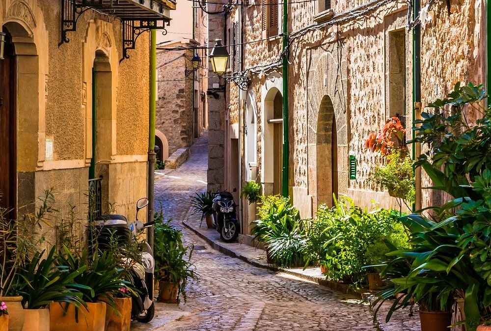 Idyllic street in the old village of Fornalutx on Majorca, Spain Balearic Islands
