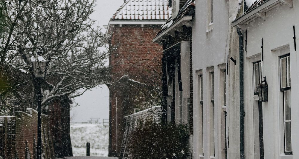 This picture gives the atmosphere of the historic town of Veere, small houses in the snow with the fortress in the background.