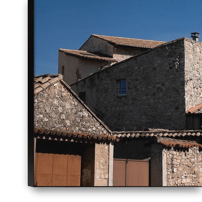 Bring the charming atmosphere of an idyllic summer house in Italy to your interiors with this beautiful photo, ideal as an artwork for your wall. The image shows a picturesque village house partially visible through an inviting gate, against a background of a clear, dark blue sky.