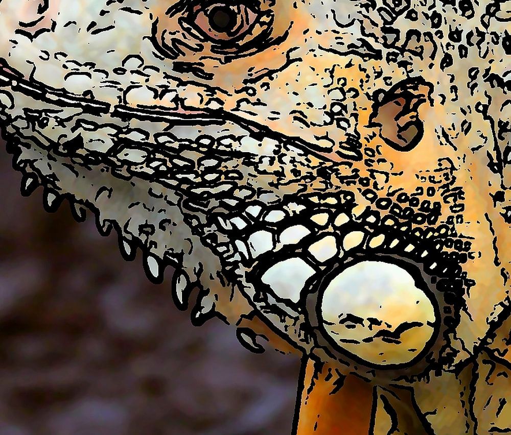 The iguana is perfectly adapted to its habitat, it has sharp and powerful claws which allow it to climb well and beautiful green color which provides camouflage. The difference between a male and female iguana is not only the length, but also the size of the throat lobe and the spiny scales on the back of the green iguana. These scales are much larger on the male than on the female. The wattles and scales on the cheek are characteristic of this large lizard. It can grow up to two meters long and can be found in the Antilles, Mexico, Central America and South America to Southern Brazil and Paraguay. It likes wet areas: coastal areas, banks of streams and rivers and the tropical rainforest. It lives alone or in groups. It feeds on leaves, flowers, and fruits, but also on insects and carrion. Green iguanas communicate with their conspecifics through body language, especially through head movements. A female usually lays about 40 eggs that hatch in 64 to 84 days. In Central America, this lizard is called a tree chicken. Because of its tasty meat, it is often eaten.
