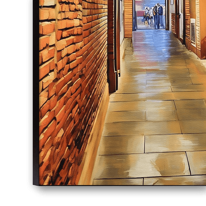 This image depicts a narrow, illuminated alleyway with brick walls and a tiled floor in Toulouse France. The alleyway is covered by a wooden ceiling with exposed beams and fluorescent lights. At the end of the alley, a group of people can be seen standing in the distance, framed by an archway that opens to a brighter area outside