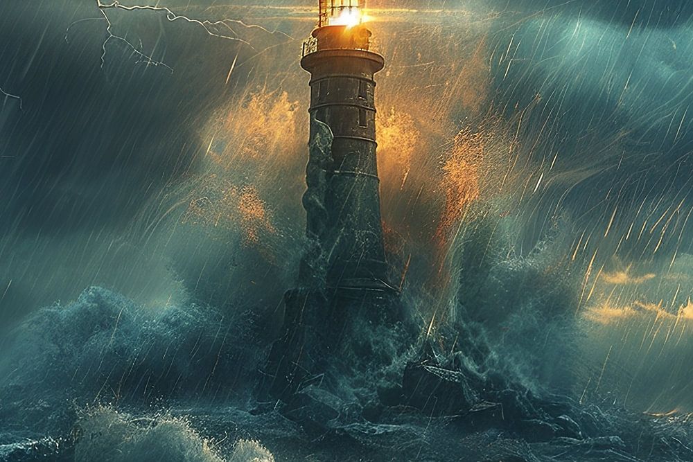 A hyper-realistic image of a lighthouse surrounded by wild waves and a violent storm with lightning in the background.