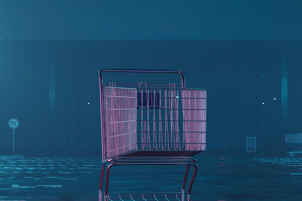 About "Illuminated shopping cart in abandoned foggy parking lot"