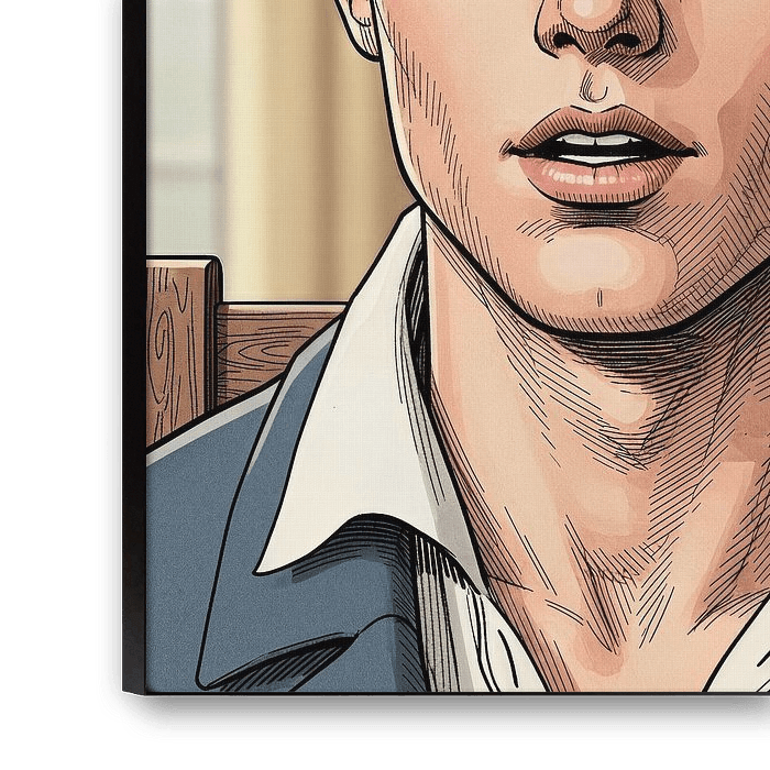 Illustration of a young man with blue eyes, brown hair, and a surprised expression in a domestic setting.