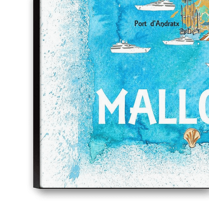 Buy this illustration Illustrated map of Mallorca Spain with sights and highlights by Markus Bleichner on canvas, ArtFrame, poster and wallpaper, printed on demand in high quality.