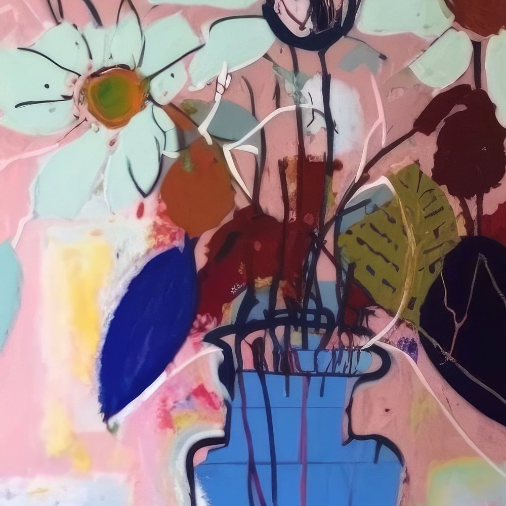 Illustration Flower power. Playful and colourful illustration of a vase with flowers (field bouquet) against an equally colourful and abstract background. Pastel and warm colours alternate for contrast.