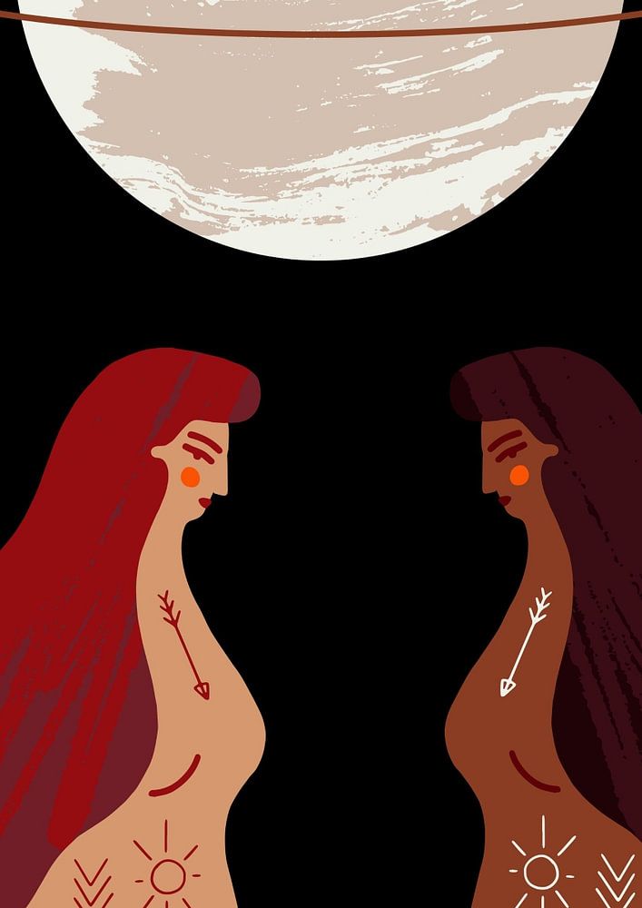 Illustration "We are one, sisterhood". Two women under a planet against a dark background. We are all one, connected to each other and the earth.
