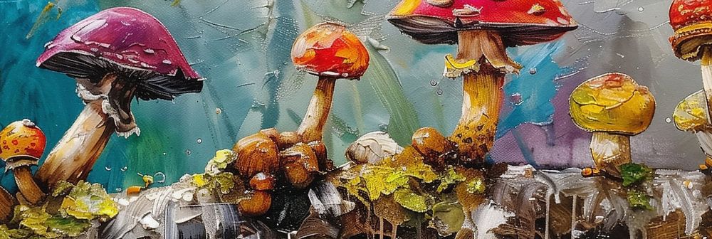 This work shows a colourful collection of mushrooms growing on a tree trunk. The vibrant hues of red, yellow and purple add a magical atmosphere to the scene. The detailed textures and contrast with the mysterious background make this work perfect for a room where a touch of fantasy and nature is desired.