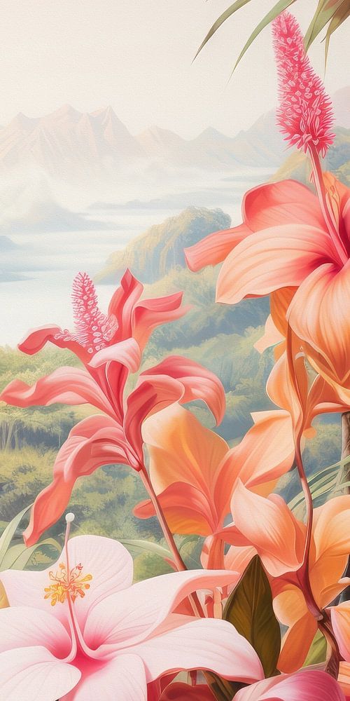 Buy this landscape artwork Imagined tropical flowers in paradise by Art Bizarre on canvas, ArtFrame, poster and wallpaper, printed on demand in high quality.