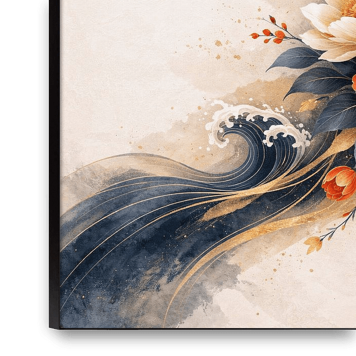 A luxurious Japanese-inspired artwork combining bold peonies with dynamic navy waves and radiant gold details. The interplay of warm orange petals and deep blue movement creates a striking visual statement while maintaining refined balance. This piece works beautifully as a centerpiece in living rooms, dining areas, offices, or…