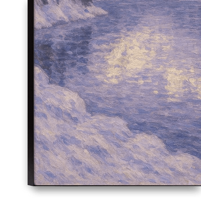 Winter Lake Serenity unfolds like a whisper of dawn. A pale sun rises over misty mountains, its reflection streaming across calm water in a single thread of silver light. This tranquil composition pays homage to Claude Monet’s lifelong pursuit of atmosphere, translating his luminous brushwork into the language of snow, stillness, and…