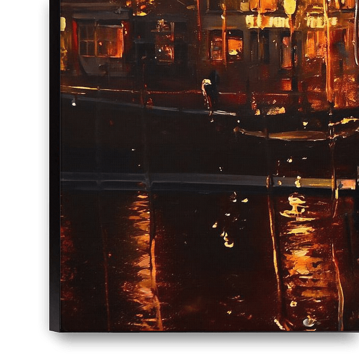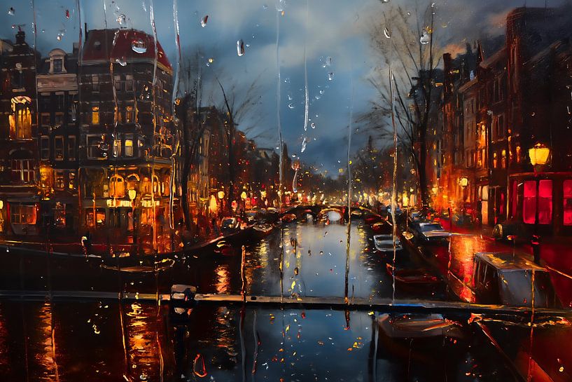 This impressionist painting depicts illuminated canals on a rainy autumn evening, seen through a window on which raindrops slowly slide down. The perspective from behind glass gives the scene a layered depth: the sharp drops on the pane contrast with the softer painted city beyond. Light reflections from street lamps and facades dance…