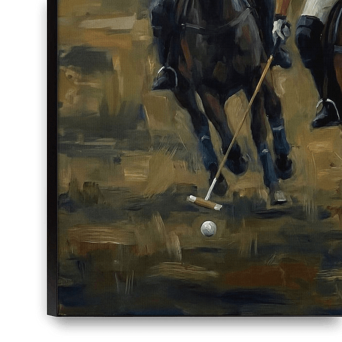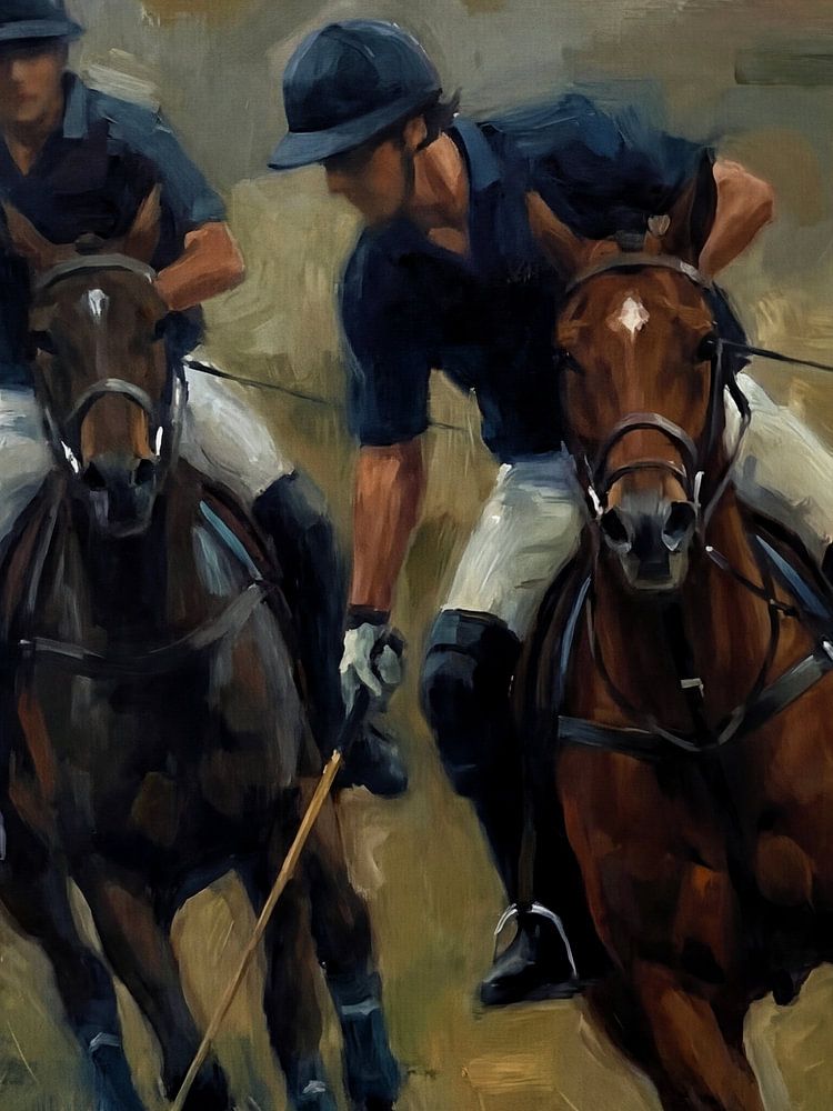 This impressionistic oil painting captures the dynamic energy of a polo match, showcasing the sport's intensity and elegance. The artwork focuses on two polo players in action, each mounted on powerful horses, as they engage in a thrilling moment of the game. The player on the left, poised with his mallet raised, contrasts with the…