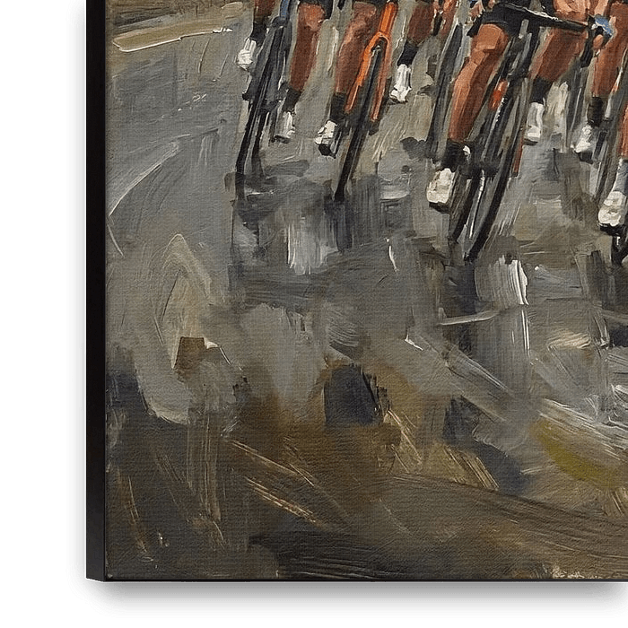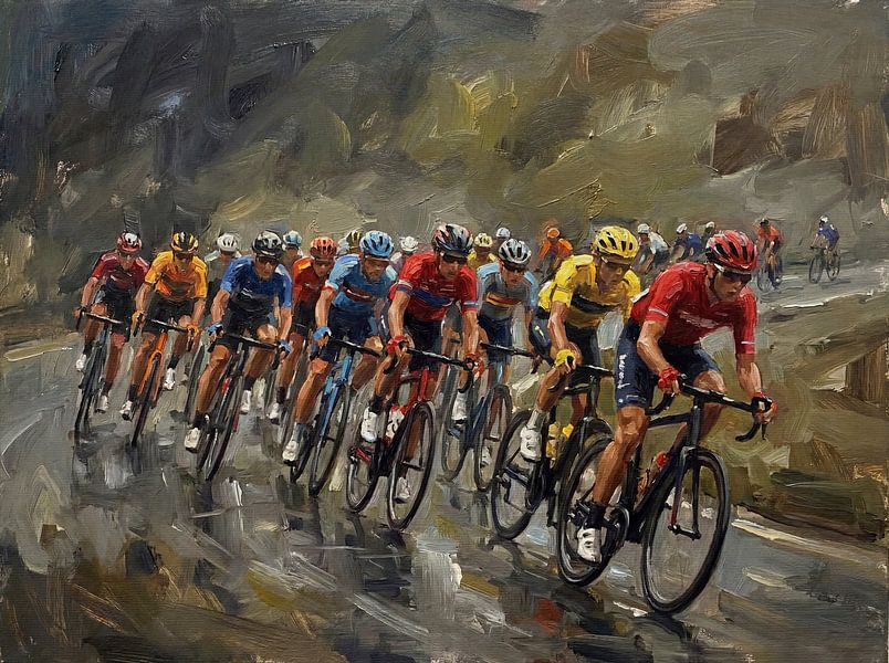 Immerse yourself in the dynamic world of professional cycling with this impressionistic painting that captures the essence of the sport. This artwork vividly portrays a thrilling road race, showcasing a peloton of cyclists navigating a winding, wet road in a mountainous region. The sport of cycling takes center stage as the artist…