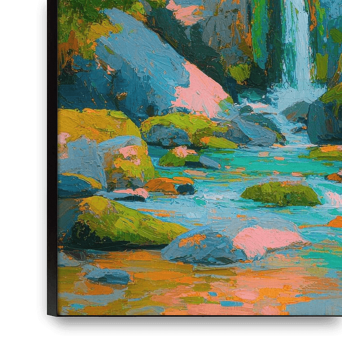 Impressionistic painting of a waterfall cascading over rocky cliffs into a turquoise river. The central motif is framed by grey-blue rocks and mossy structures. The water surface displays flowing textures in turquoise and light blue with colourful reflections. Autumn foliage in yellow, orange and red lines the banks, forming a warm…