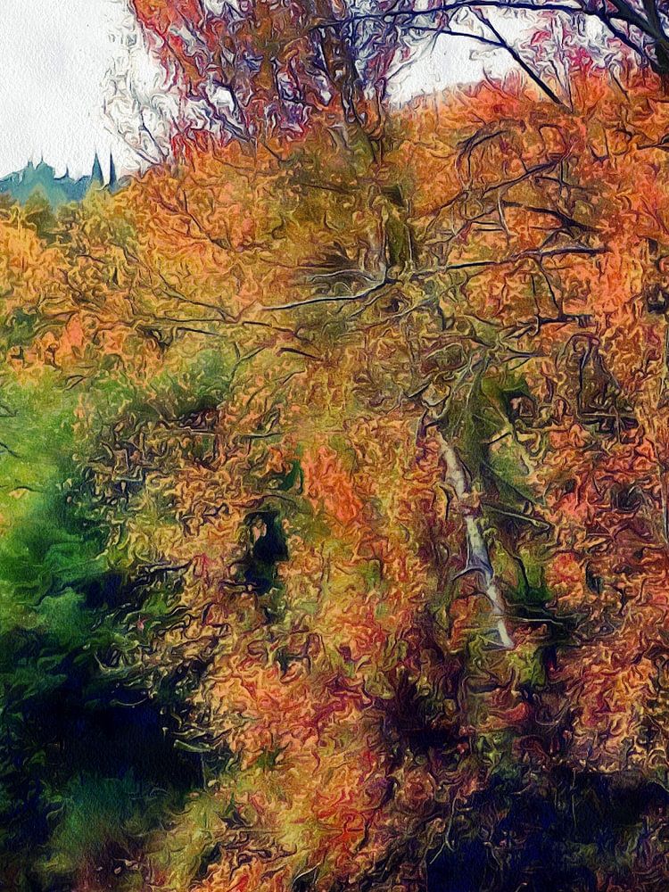 I took a very loose approach to this photo art image of a beautiful scene in Tuscany. Late Autumn colour abounds in these trees and the ground is dusted with red and golden coloured leaves.