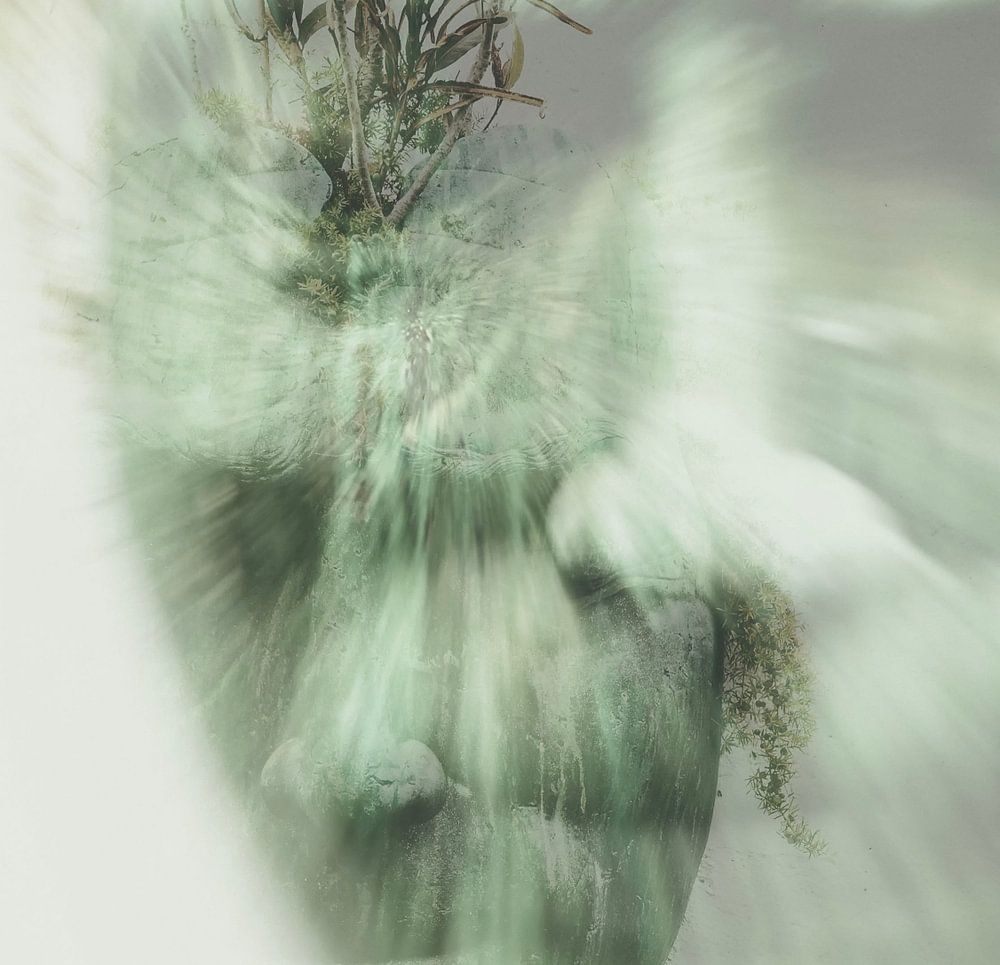 The soft, almost pastel shades of green and grey, combined with the hazy, radiant effects, create a sense of mystery and inner reflection. It is like catching a glimpse of a thought, a memory, or a hidden emotion slowly unfolding. The subtle plant structure that seems to sprout from the head adds an organic and symbolic element, referring to growth, life and the complexity of the human mind.