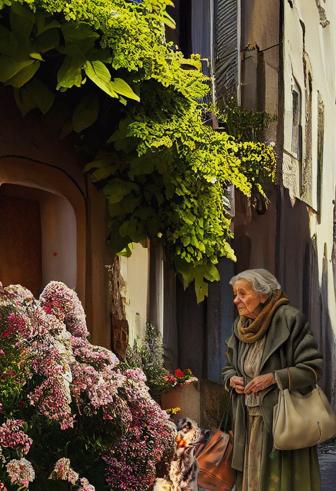 And then suddenly you get a thought of if I generate a street somewhere in an old French village, what can I do with that? So that's how I started, then you start looking at further interpretation, So adding people and animals. But you're not done with that yet, then the editing part comes around the corner.  Setting the various items free (making them transperant), setting up the composition, placing the various items in the image and editing.