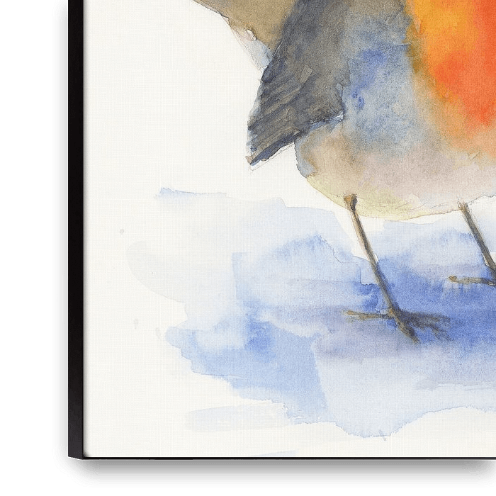 A small robin with a bright orange breast stands on a light blue shadow. The background is minimalist and emphasises the colourful presence of the bird. The little bird looks…