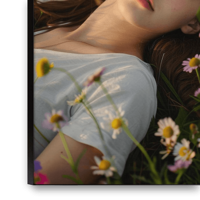 A girl lies in the middle of a blooming sea of meadows, surrounded by colourful wildflowers. Her long, shiny hair merges with nature, while her radiant gaze reflects the beauty of her surroundings. The soft lighting gives the picture a dreamlike, almost magical atmosphere. A perfect moment of harmony between man and nature.