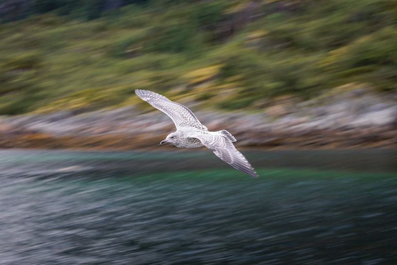A seagull photographed in flight via a towed camera. Trollfjord, Norway.