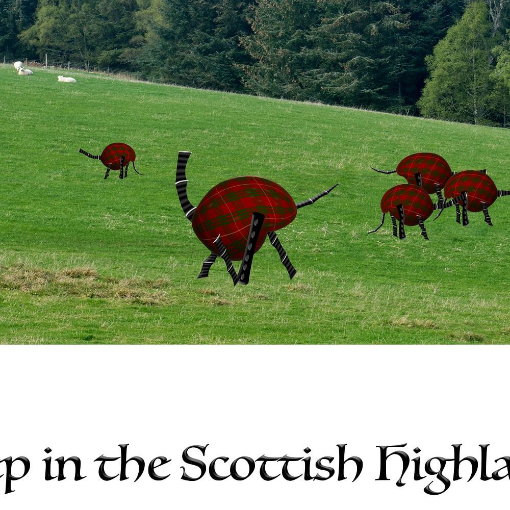 About "In the Scottish Highlands, Bagodoodles (Peratibia Scocie) graze peacefully in the summer sun."