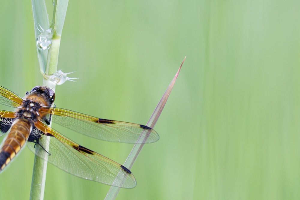 Four-spotted dragonfly against a green background.