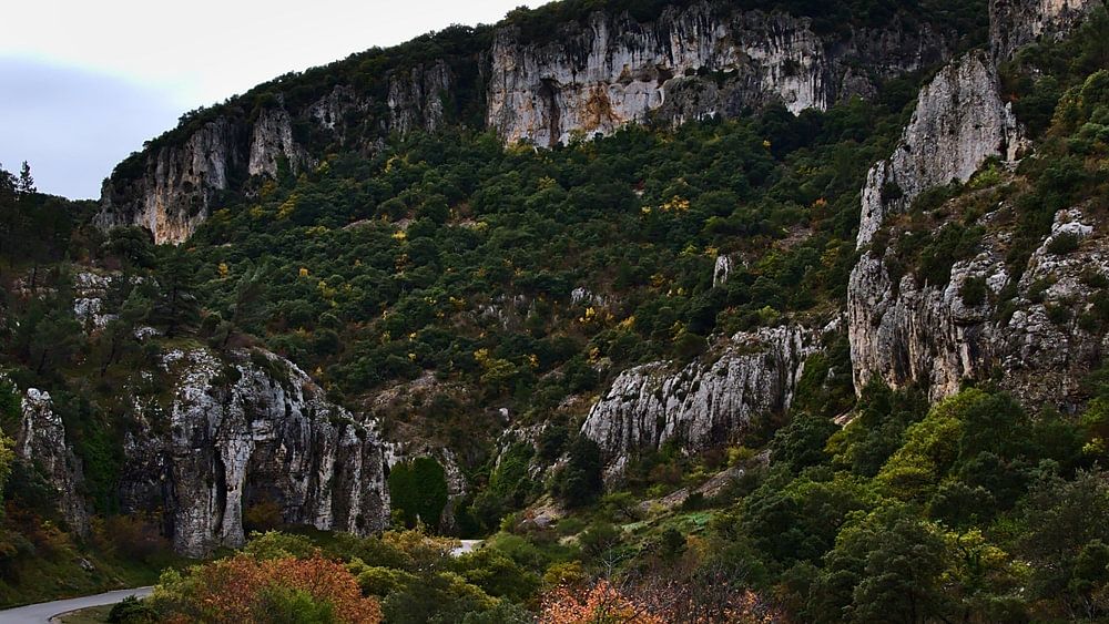 The narrow, paved D177 country road winds through a gorge in the mountains of Vaucluse in Provence in the south of France on a cloudy day in autumn with craggy rocks and brightly colored trees.