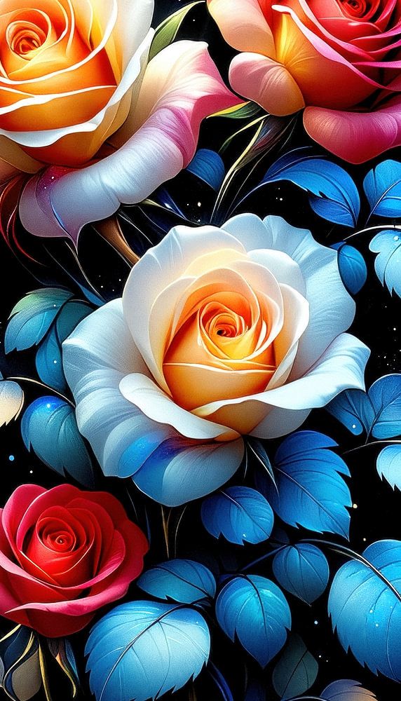 This majestic mural elevates the rose, the queen of flowers, to an impressive ode and invites the viewer to savour its timeless grace. Whether presented individually or combined as a harmonious group of three to form a triptych, an exquisite range of colours unfolds: cobalt blue and dark red roses of glowing intensity enter into a sensual dialogue with blossoms in shades ranging from ivory to delicate rosé.