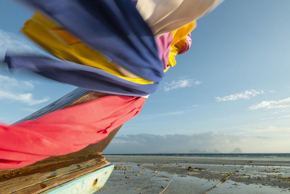 The day begins tentatively over Koh Ngai. The first rays of sunlight graze the dormant longtail boat, which lies at an angle in the damp sand at low tide. The pha phra flutter at the bow of the boat - colourful fabric ribbons that the fishermen use as spiritual symbols to ensure protection and blessings during the journey. Now, however, they dance alone in the light morning breeze, as if welcoming the new day.