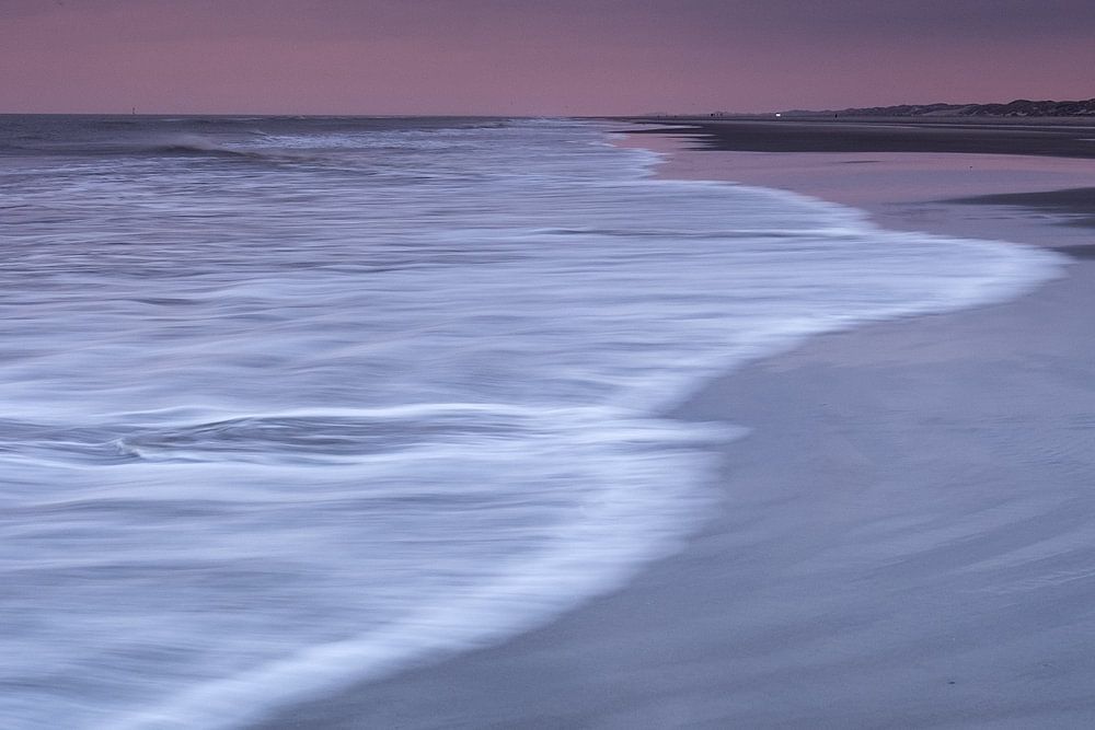 Time recording of incoming waves on the North Sea beach of Terschelling during sunset.