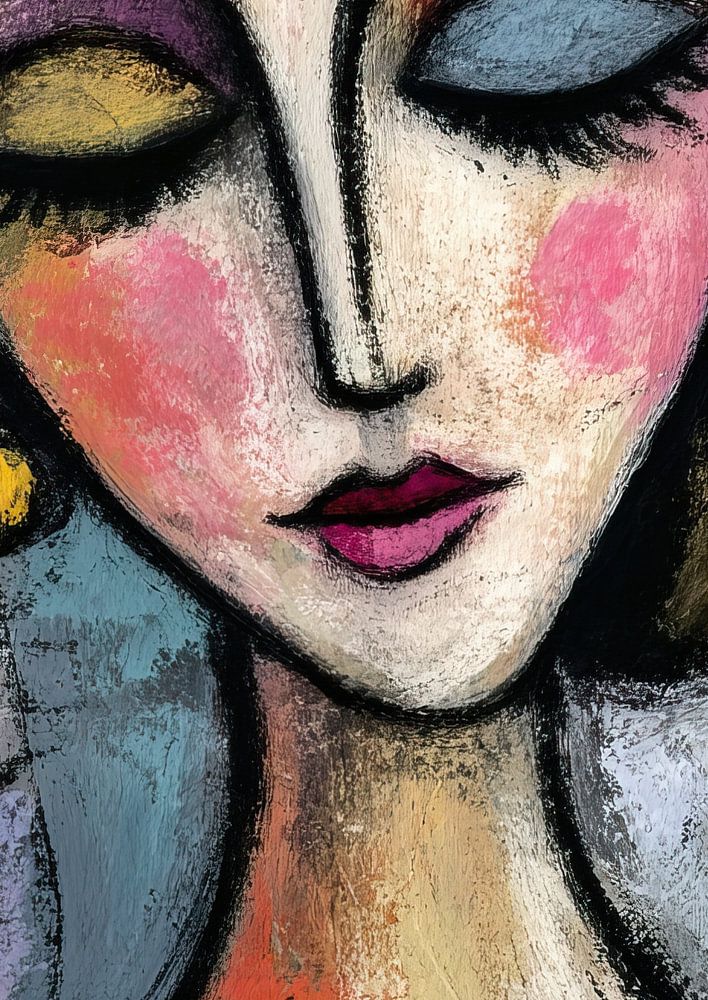 Details: women painting, abstract, colours, earring, make-up, face, bright colours, modern, woman, art