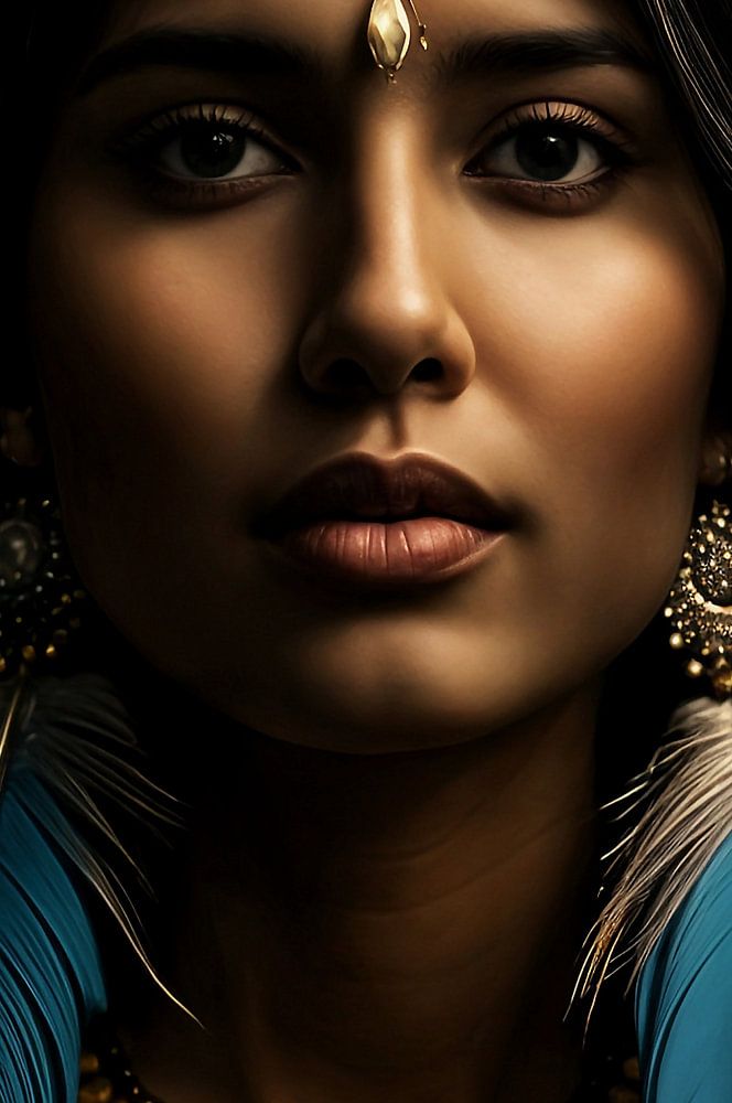 Around her are various natural elements that emphasise her connection to the earth and the spiritual world. Delicate plants and flowers seem to cluster around her, while gentle winds blow through the scenery. The Indian woman also wears elaborate jewellery made from natural materials, which emphasises her connection to nature. Her hair is elegantly styled, possibly with feathers or other decorative elements that reflect her cultural significance.