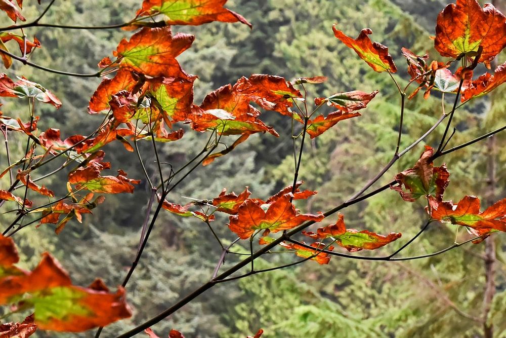 Closeup of a Canadian maple tree in fall. The beautiful brown and red autumn colors of the leaves are set against the green of the pine tree in the background which provides a nice impression of the Indian summer in Canada.