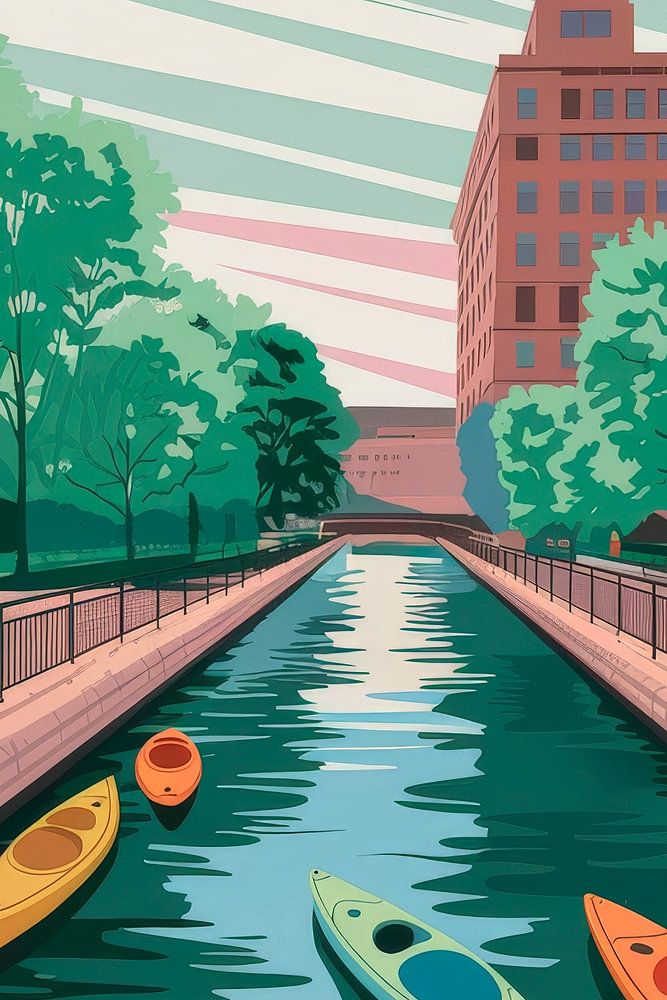 Framed by soft pastel colours and lively canoeists, the scenery in Indianapolis exudes a sense of freedom and adventure. The tranquil canal, lined with lush greenery and an urban backdrop, invites you to leave the hustle and bustle of everyday life behind. Ideal for a living room to create a relaxed atmosphere.