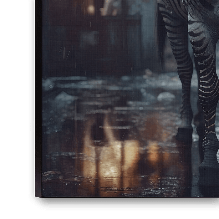 The picture shows a majestic zebra standing in the middle of a narrow alley in an industrial zone of a city. The street is wet and it seems to have just rained. A small bar can be seen in the background, which is slightly blurred in the picture. The zebra is standing calmly and is not impressed by the cold and industrial environmental conditions. The picture conveys a strange atmosphere because the animal appears so unexpectedly in this environment.